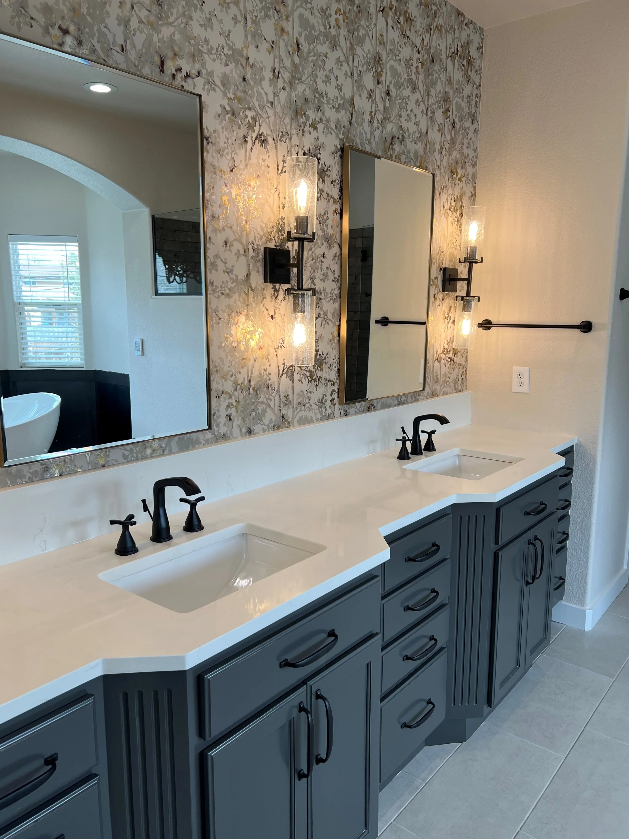 Double bathroom vanity with dark gray cabinets, white countertop, two sinks, and black faucets. Wall-mounted mirrors, decorative wallpaper, and wall sconces with glass covers on a textured wall. Towel bar, electrical outlets, and part of a white bathtub with a window in the background.