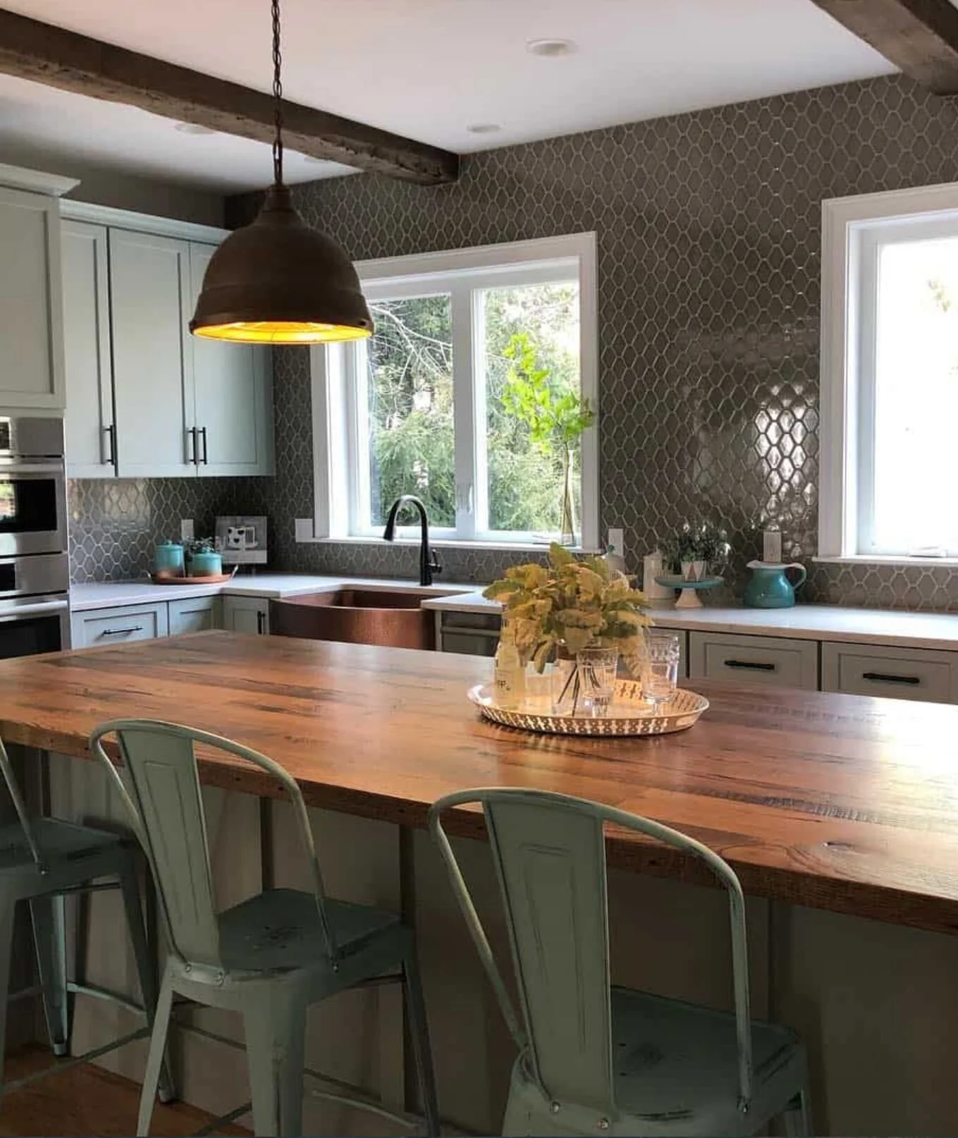 A 1980s kitchen with inadequate storage and an inefficient layout was demoed and replaced with chic grey shaker cabinetry and stainless steel appliances. Storage was greatly increased with 42” wall cabinets, two large drawer bases, and an elongated peninsula that houses pull-out trash and recycle bins. A soft grey dimensional subway tile backsplash and two sparkling pendants add shine and reflection to the space.