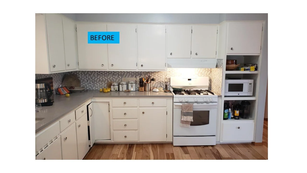 Kitchen with white cabinets, a stove, microwave, and open shelves, annotated with a blue label 'BEFORE.'